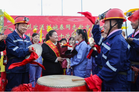 (2022年10月7日,淮北矿业集团在桃园矿举行仪式,欢送党的二十大代表、桃园矿保运区职工刘婉春赴北京参加中国共产党第二十次全国代表大会。)
