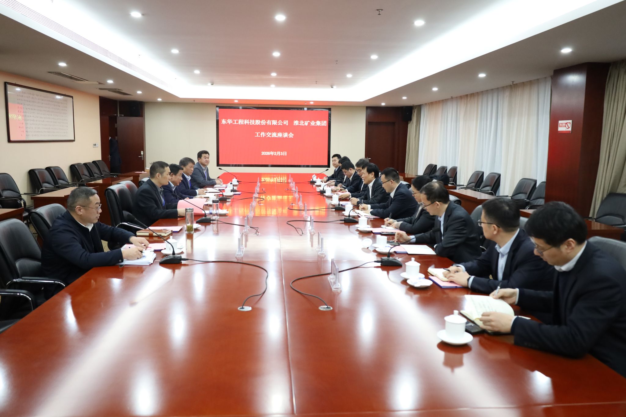 2月3日,淮北矿业集团与东华工程科技公司举行工作交流座谈会。淮北矿业集团党委书记、董事长、总经理孙方,淮北矿业财务总监殷召峰;东华工程科技公司党委书记、董事长李立新,党委副书记、总经理孟陈周,党委委员、副总经理叶平,以及双方相关部门负责人参加座谈。