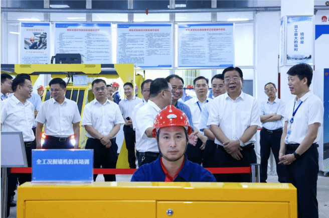 2025年8月“党管培训”现场推进会上,集团领导实地观摩掘锚护一体机仿真培训设备演示。