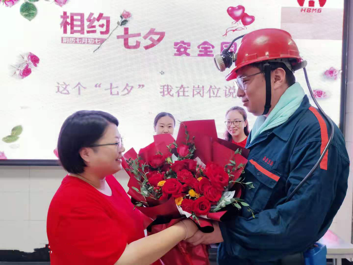 中午11时许,一阵上井的铃声响起,一批工作后的职工从井下升井到了地面,当他们看到满满一车的玫瑰花出现在井口,眼神中流露出了既惊讶又高兴的神采!等候已久的职工家属向他们献上了一束饱含深切爱意和平安期盼的红玫瑰。