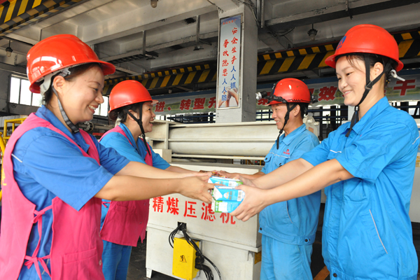 9月17日,临涣选煤厂工会工作人员带着月饼、牛奶、火龙果等大礼包下车间、进班组、到岗位,为中秋、国庆“两节”期间坚守岗位的员工送上“安全大礼”和“安全警语”,嘱咐员工生产工作再忙、安全时刻不忘。(撰稿、摄影:石启元 审核:朱丽)
