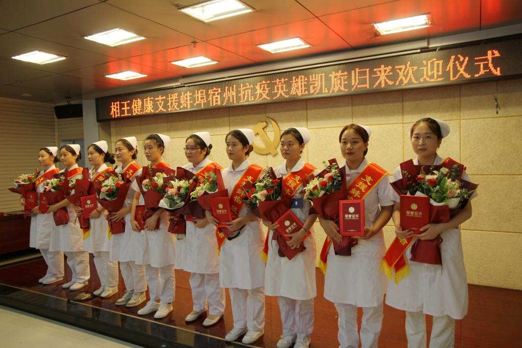 鲜花掌声欢迎英雄凯旋。8月11日,相王健康公司举行支援蚌埠、宿州抗疫英雄凯旋欢迎仪式,隆重表彰支援抗疫一线的“最美逆行者”。