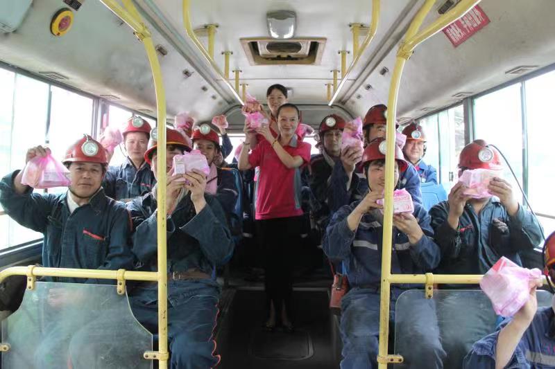 童亭矿组织协安员在通勤车上慰问广大一线职工,为他们送去月饼、牛奶、面包等慰问品,并送上节日的美好祝福!