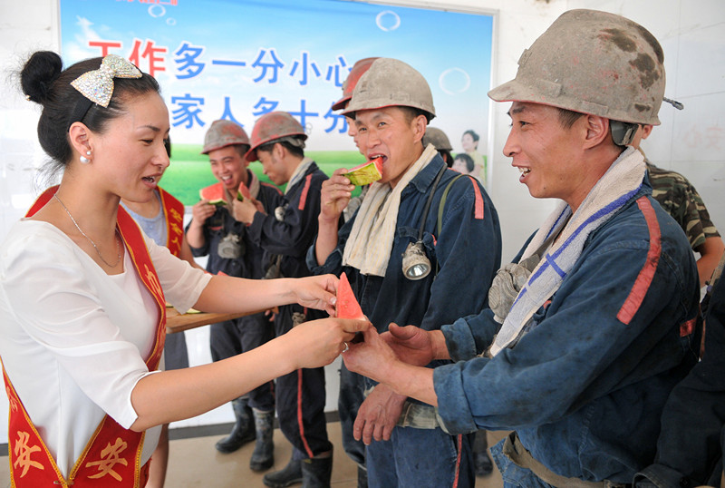入伏以来,袁店二矿在井口设立“清凉驿站”,备足绿豆汤、西瓜、清凉油等防暑降温用品,让职工“清凉一夏”,受到职工欢迎。图为协安员把西瓜送到一线职工手中。