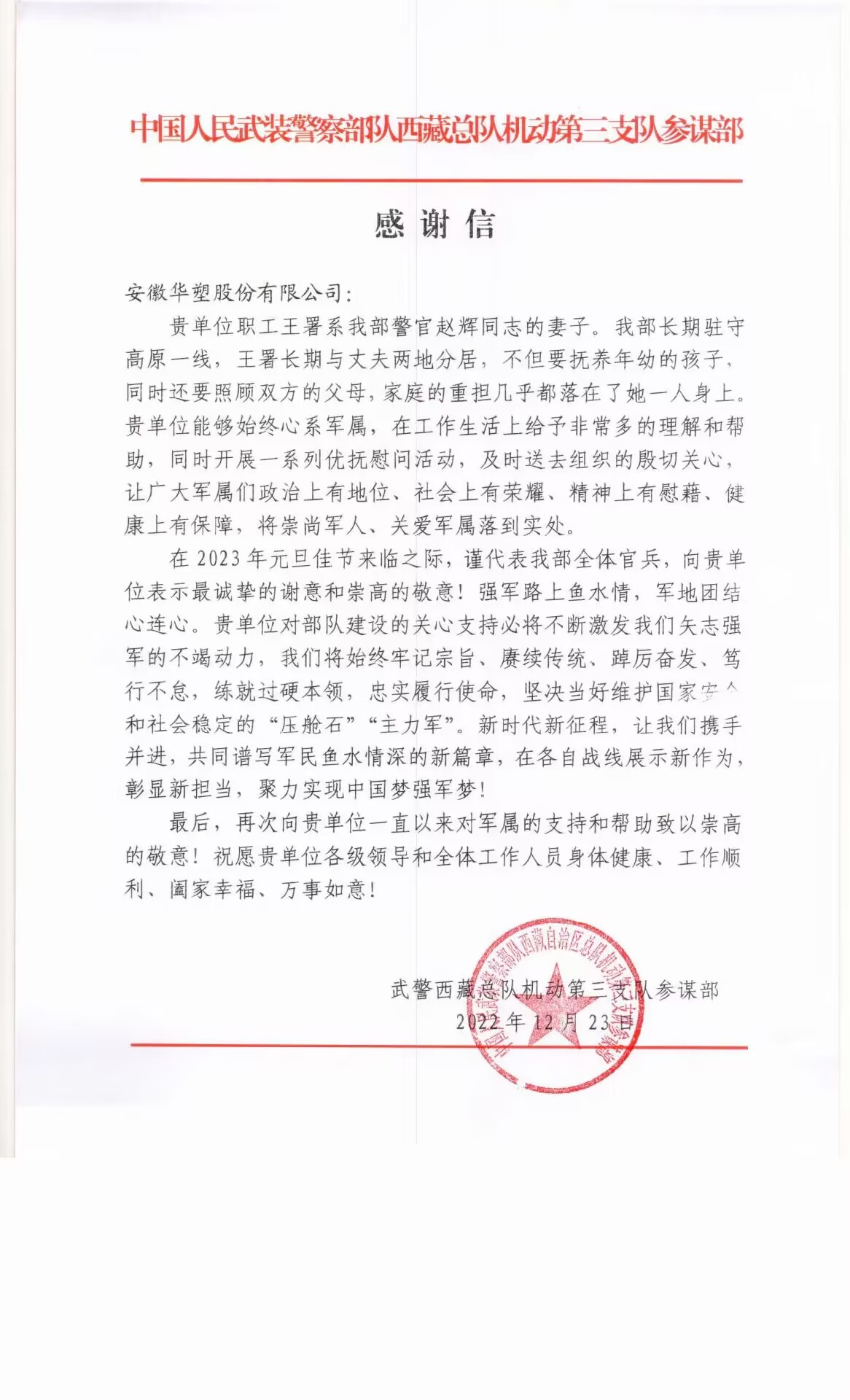 “贵单位在工作生活上给予非常多的理解和帮助,同时开展一系列优抚慰问活动,及时送去组织的殷切关心,让广大军属们政治上有地位……”2023年元旦前夕,华塑股份公司收到一封来自武警西藏总队某部的《感谢信》。