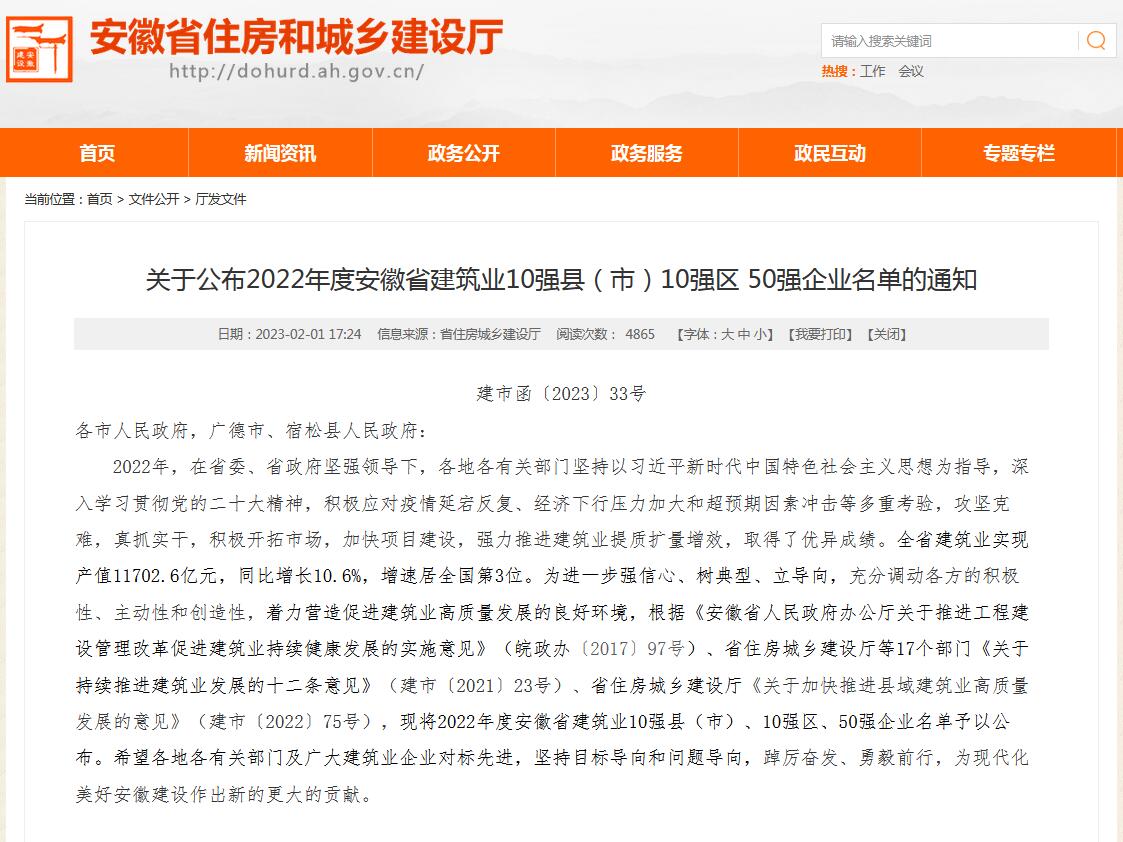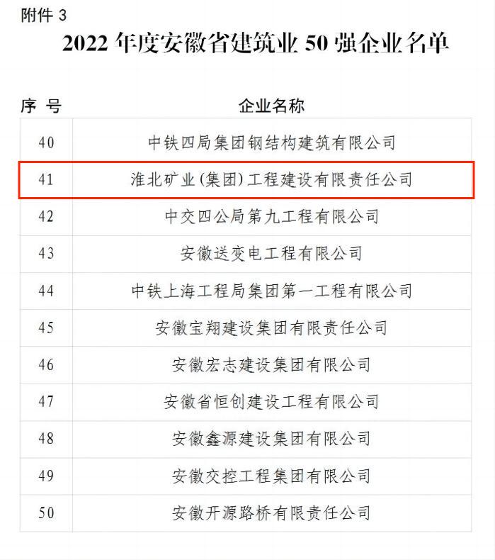 近日,省住房和城乡建设厅公布《2022年度安徽省建筑业50强企业名单》,工程建设公司再次荣登榜单,位列第41位,较上一年度上升5位。再获殊荣,标志着该公司综合实力、行业竞争力、品牌影响力的再次提升。