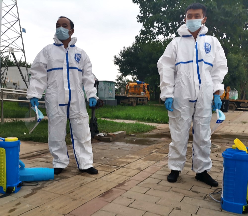图为王雷(左一)开展灾后防疫消毒消杀
