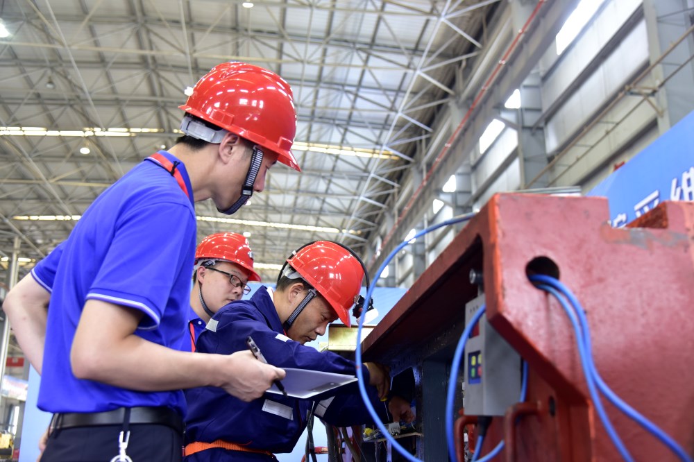 图为屈彦飞(右一)在安徽省煤炭行业综采维修电工职业技能竞赛实操考核中沉着应战