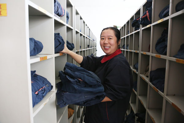 王影正在将清洗干净的工作服放进衣柜。对于洗衣房的姐妹们来说,职工满意就是她们的工作标准。