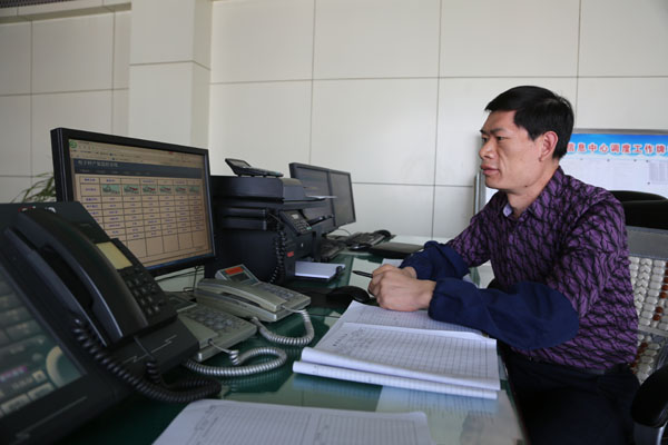 在安全生产信息中心,调度员叶克才正注视着电脑屏幕上的762工作面产量数据变化情况。国庆节当天,这个面共生产原煤3030吨。(责编:徐成贵)