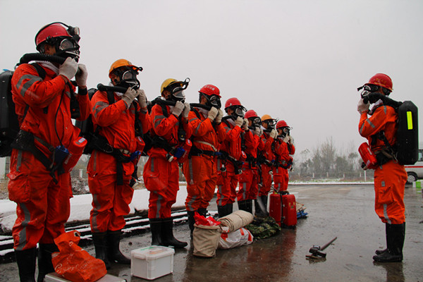 从11月24日开始,救护消防大队将举行为期四天的高温浓烟演习,以中队为单位在地下模拟演习巷道内突出灾区侦察、抢救遇险人员、灾区封闭等项目的演练,全面锤炼队伍在复杂条件下处置突发情况的本领和指挥员的应急指挥能力。图为演习第一天,矿山救护队员冒雪进行演习前的安全确认。(责编 姚春雷)