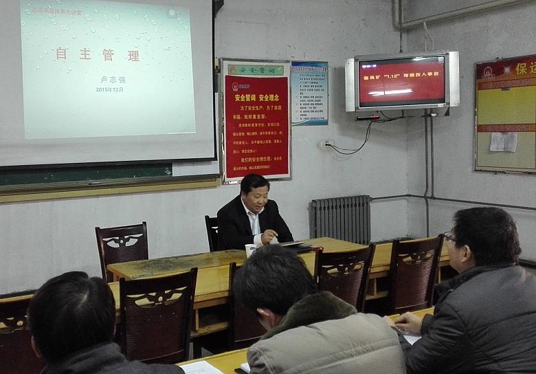 在保运一区会议室,副矿长卢志强以自主管理为主题,结合多年来安全管理和机电运输管理工作的经验和体会,以课件的形式,图文并茂地从自主管理的意义、要素和系统内自主管理的实例三个方面进行了讲解。通过授课,进一步提高了机运系统班队长以上管理人员对科区、班队管理的认识,为安全生产打下了基础。