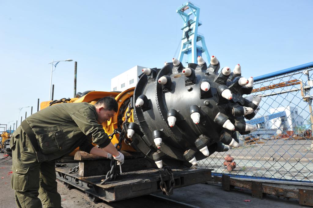 4月22日,青东煤业EBZ-200综掘机整装准备下井,该设备适用大角度掘进施工,将有效提升掘进效率,为缓解生产接替紧张局面提供设备保障。图为工作人员在综掘机下井前紧固装车锚链。