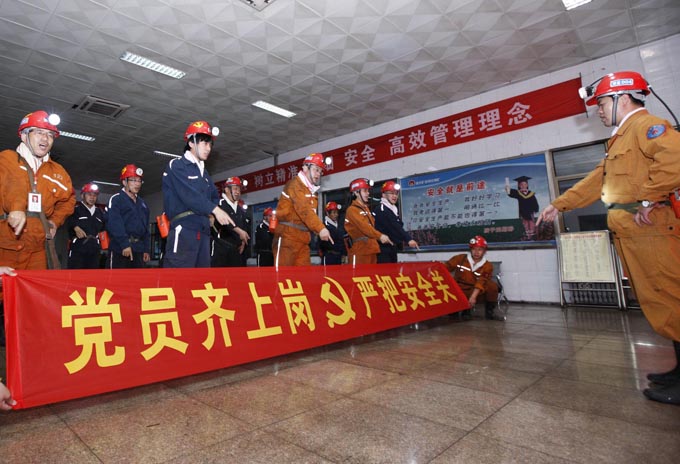 杨庄矿注意发挥共产党员在安全生产中的模范带头作用,定期和不定期组织党员集体上岗,深入井下查隐患,堵漏洞,确保了矿井安全生产。
