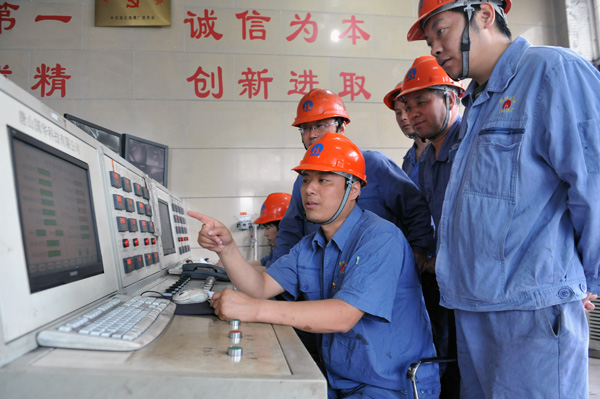 5月23日,淮北选煤厂选煤车间党员干部杨永锋(中)正在重介控制室内向职工分析降低介耗、提升精煤产率的要点。该厂在开展“两学一做”学习教育中,把“示范引领”作为重点,实施“干部担当”工程,党员干部立足选煤实际,带头开展技术创新与小改小革,用智慧破解难题,用行动作出表率,彰显了党员本色。