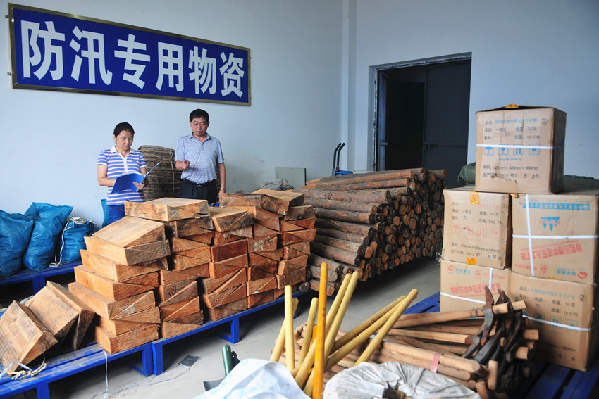 入汛以来,袁店二矿立足于防大汛抗大涝,备好备足手镐、木桩、竹筐、水泵等防汛设备和物资,保证职工生命和企业财产安全。图为该矿库管员在查验防汛专用物资。