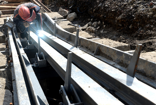图(2)朱仙庄矿2名职工在对改造排矸系统进行运输安装。