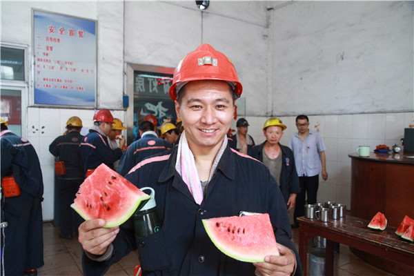 “一上窑俺就闻到西瓜的味道了,咋样,我说是咱公司工会送西瓜来了吧。说的没错吧。”是的,我好远也闻到西瓜味了呢。”淮北双龙公司的几位下井工人走着说着笑着。“来,师傅们辛苦了,快吃块西瓜解解渴,我们早在这等你们了。”淮北双龙公司井口传来协安员们的温馨话语声。