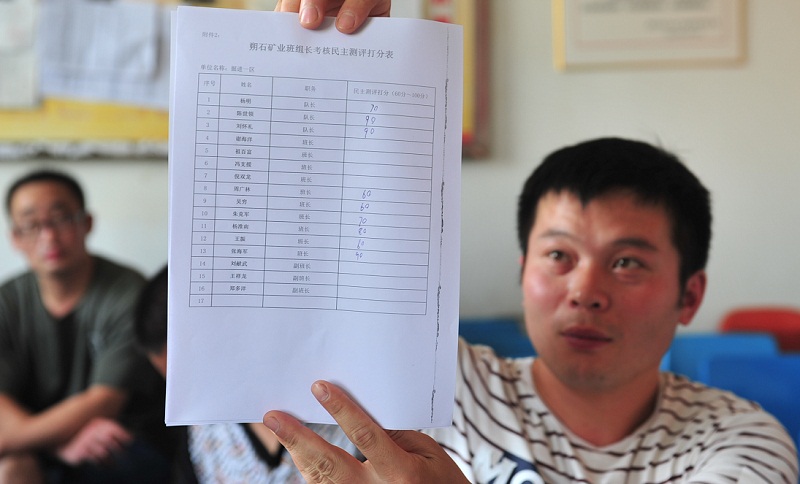 8月15日,朔石矿业东部井掘进一区职工手持刚刚填写的《班组长考核民主测评打分表》。