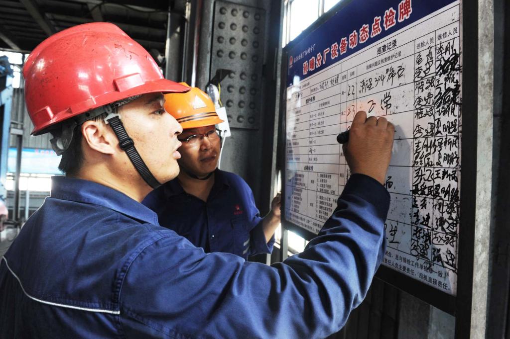 今年以来,针对设备老化和锈蚀严重等问题,临涣选煤厂加大设备维护保养力度,全面实施设备点检管理制度,通过设备点检牌板,实时记录设备保养、维护及完好状况,保障了安全生产。图为8月24日该厂孙疃分厂职工正在记录设备点检信息。