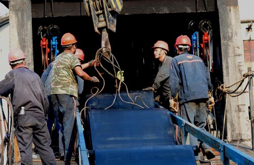 抢修期间,矿调整生产运煤系统进行转运煤。