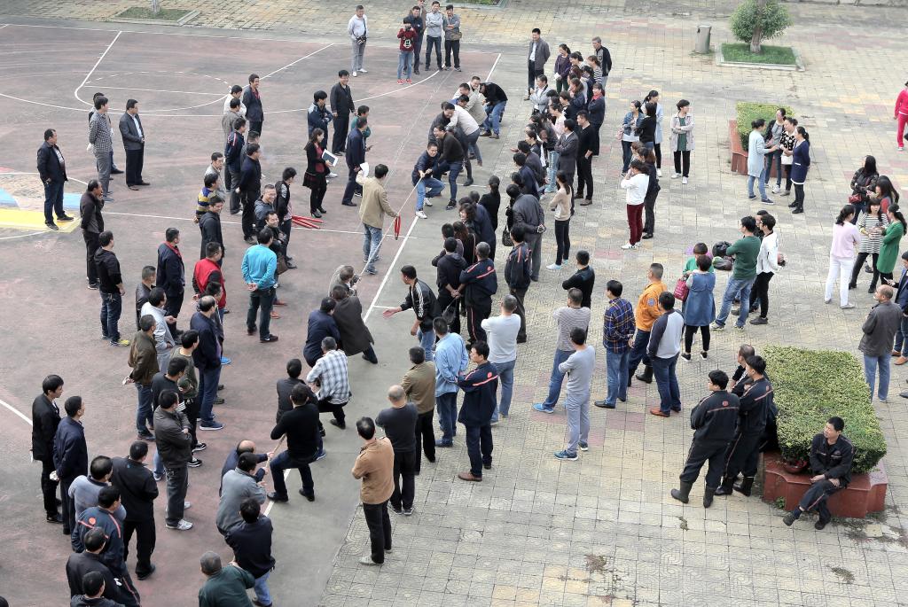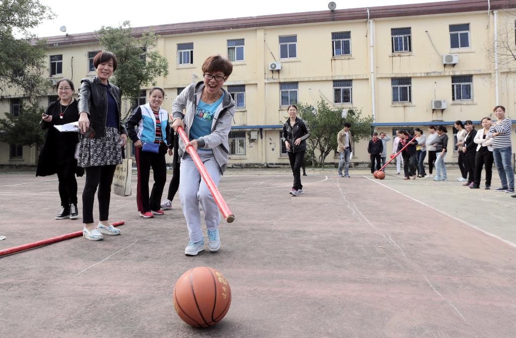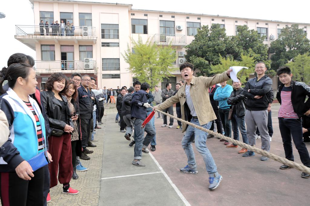 广场中心的拔河比赛人头攒动,保运区代表队与机电科代表队正在激烈的争夺第一名次。广场东面,女工们欢声笑语,开心的进行企鹅漫步、二人三足跑、穿衣接力等的趣味游戏,整个广场一片欢乐。