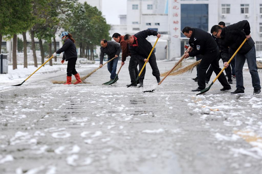 11月23日,袁店二矿物业公司职工在铲除路面冰雪。当日,该矿物业公司组织职工开展矿区主要道路的积雪清扫工作,确保职工及家属出行安全。11月22日下午至23日凌晨,皖北地区迎来了今年冬天首场降雪。(责编:徐成贵)