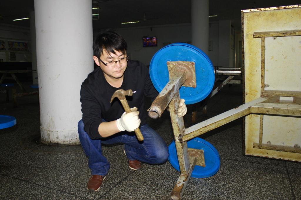 今年以来,为应对严峻市场形势,杨柳煤业千万百计降本增效,除以安全技术经济一体化为抓手,严控重大成本投入,编制材料、设备采购“黑名单”等手段以外,高度重视回收复用、修旧利废和自制加工等工作,坚持抓大不放小,从一点一滴中“挤”效益,做到“应修尽修、该收尽收、能制尽制”。截至10月底,矿井回收复用、修旧利废、自制加工共完成产值4100多万元。图为该公司职工利用废旧钢管给已坏餐桌装“假肢”。