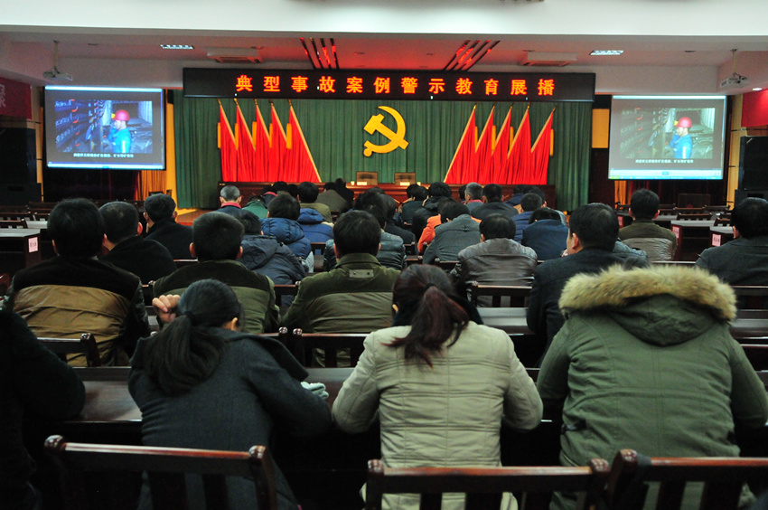 袁店二矿以“百日安全会战”为契机,深入开展多种形式的安全警示教育活动,为职工敲响安全警钟,坚决防范各类事故发生,确保实现“四零”目标。图为职工在观看典型事故案例警示教育片。