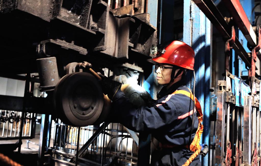 图为:12月5日,机电科一名职工在新副井口进行设备维护和隐患排查。