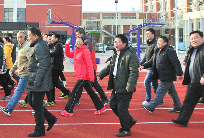 12月28日下午,安徽淮北煤电技师学院一名女职工在行进的队列中向大家招手致意。当天下午,该学院体育运动场笑语欢声、气氛热烈,学院工会组织全院教职工开展了“大步向前”和“拔河比赛”两项文体活动。在辞旧迎新之际,让紧张忙碌了一年的教职工得以欢聚交流、放松心情,同时藉此进一步增强团结、互助和竞争意识,以饱满的热情迎接新一年的工作。