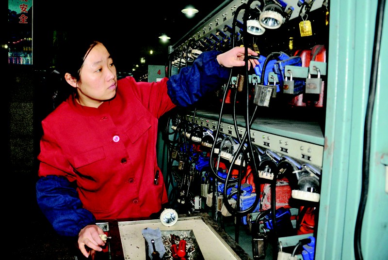 朱仙庄矿灯房班女工树立“您的满意我的标准”的服务理念,为全矿近2000盏矿灯和自救器建立检修台账,对每盏矿灯、每个自救器实行一日一检,及时消除故障,确保了百米井下矿工的安全使用。图为该矿灯房班一名女工正在检查维修矿灯。 (王道玉 摄)