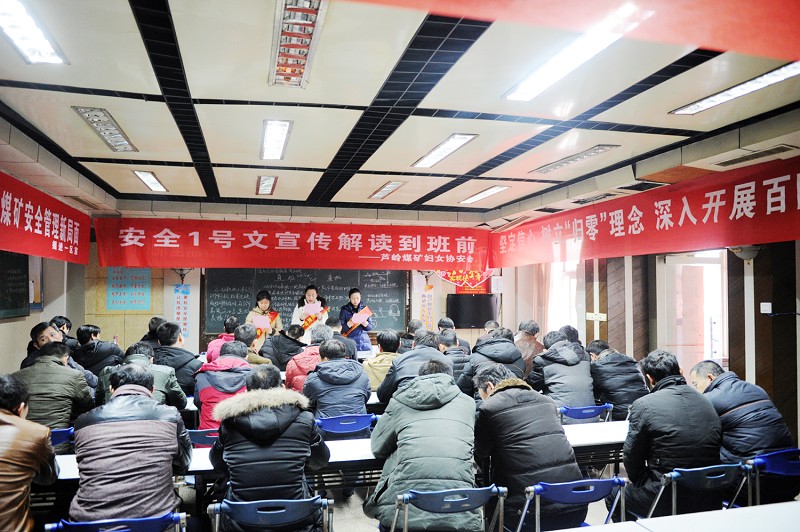 芦岭矿多种形式把淮北矿业2017年安全1号文精神宣传贯彻到每一名干部职工,做到家喻户晓,人人皆知,让安全政策落地生根,确保实现“百日安全会战”目标和首季开门红。图为该矿开展安全1号文宣传解读进班前活动现场。 (王盟 昌涛摄)