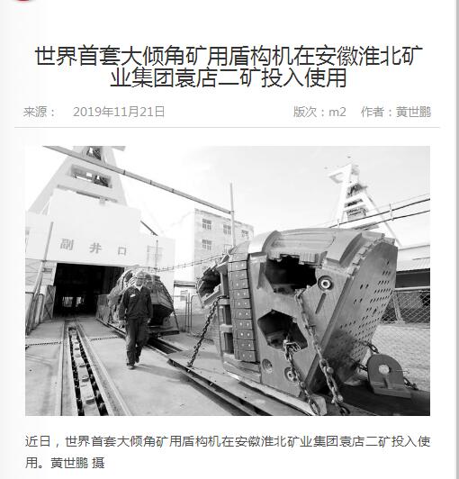 《中国煤炭报》:世界首套大倾角矿用盾构机在淮北矿业投入使用