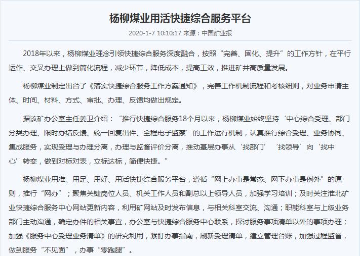 《中国矿业报》:淮北矿业集团杨柳煤业用活快捷综合服务平台