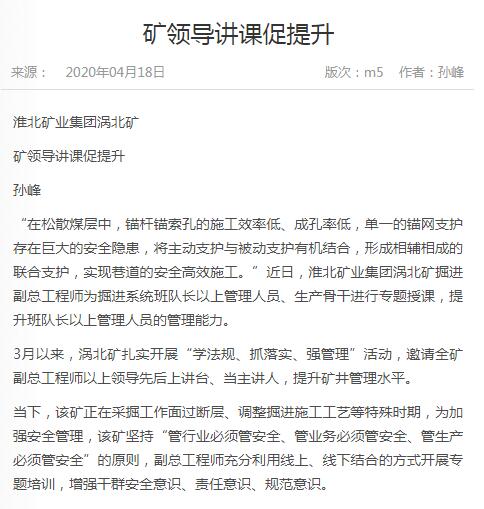 《中国煤炭报》:淮北矿业集团涡北矿矿领导讲课促提升