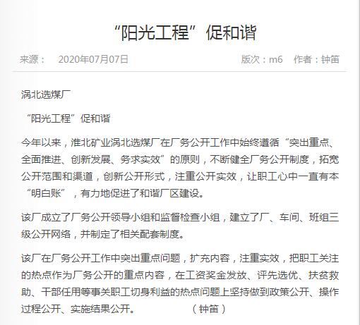 《中国煤炭报》:淮北矿业集团涡北选煤厂“阳光工程”促和谐