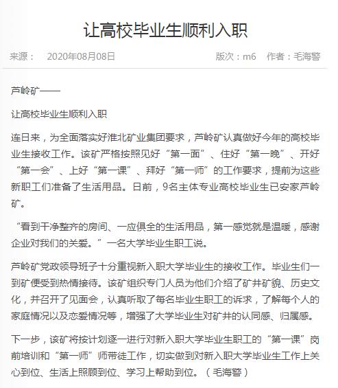 《中国煤炭报》:淮北矿业集团芦岭矿让高校毕业生顺利入职