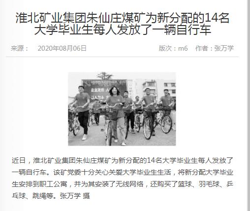 《中国煤炭报》:淮北矿业集团朱仙庄矿为大学生发放自行车