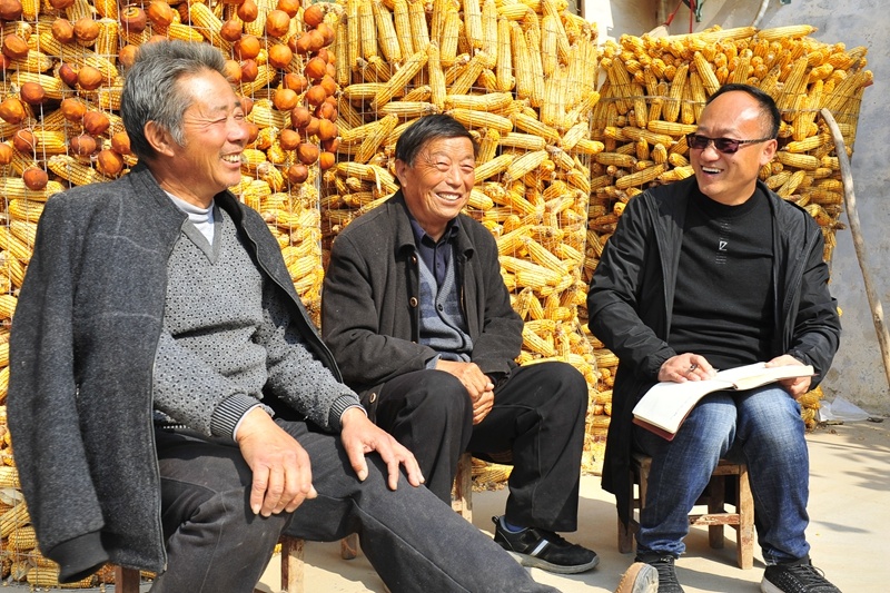 省优秀下派干部、淮北矿业集团扶贫干部杨占勇(右一)与村民共话丰收喜悦(乔时庆 摄)