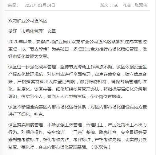 《中国煤炭报》:淮北矿业集团双龙矿业通风区做好“市场化管理”文章