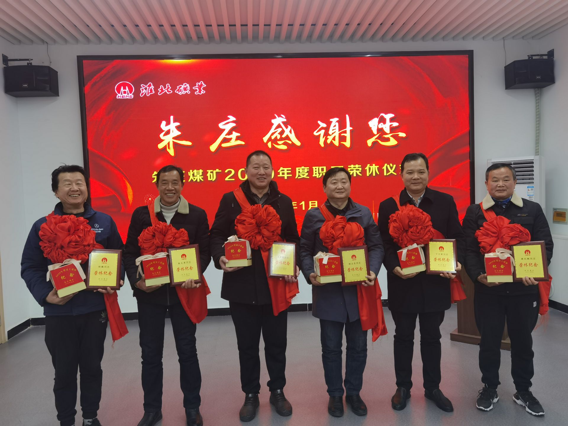 这么暖心的场面太令人回味了,一辈子忘不掉。”“真真切切让我们收获了归属感和荣誉感。”……1月29日下午,淮北矿业集团朱庄矿职工活动室内,来自采掘、辅助、地面各岗位的6名退休(离岗)职工披红挂花,接受矿领导为他们颁发的荣休纪念牌、精美纪念品,接受职工为他们送上的掌声和祝福,幸福荡漾在脸上。