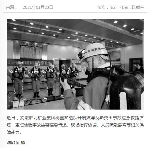 《中国煤炭报》:淮北矿业集团桃园矿开展煤与瓦斯突出事故应急救援演练