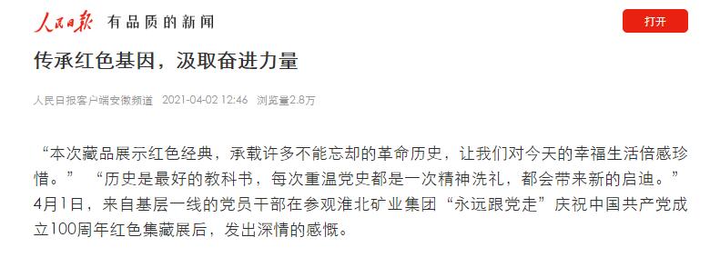 3月31日,淮北矿业集团党委书记、董事长方良才在参观展览后指出,参展的红色藏品是具有淮北矿区特色及煤炭工业文化特色的红色资源,一定要充分利用好这些红色资源开展党史学习教育活动,讲好红色故事,打造红色品牌,引导广大党员干部群众不断从党的百年历史中汲取智慧力量,从国家煤炭工业发展建设的历程中汲取奋进勇气,以新作为新成效加快推动企业高质量发展。
