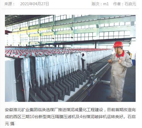 《中国煤炭报》:淮北矿业集团临涣选煤厂推进煤泥减量化工程建设