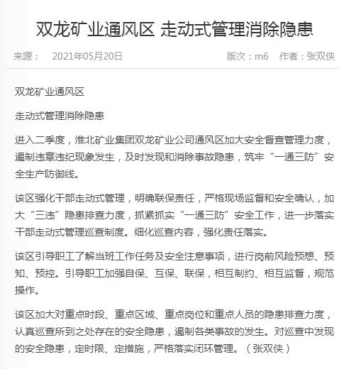 《中国煤炭报》:淮北矿业集团双龙矿业通风区走动式管理消除隐患