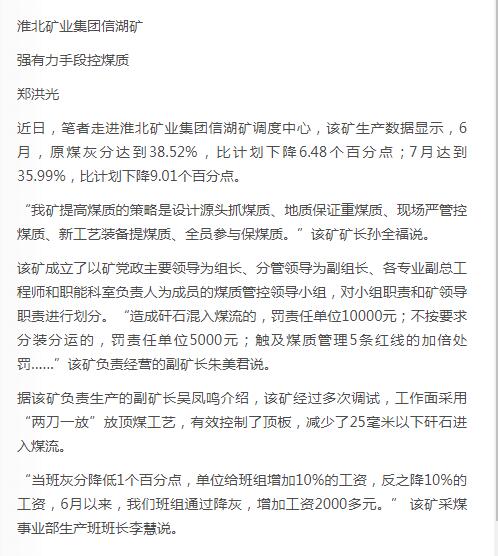 《中国煤炭报》:淮北矿业集团信湖矿强有力手段控煤质