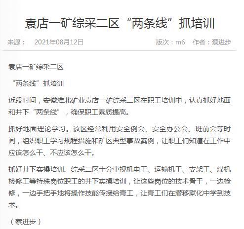 《中国煤炭报》:淮北矿业集团袁店一矿综采二区“两条线”抓培训