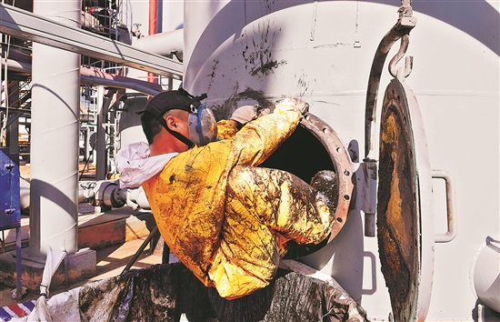 塔内空间有限,其他设备进不去,维修工只能用一根细铁丝一点点疏通。天气热、空间小、装备笨重,为了安全起见,每人干20分钟必须出舱休息。(陈春秋)