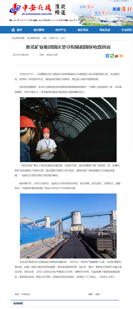《中安在线》:淮北矿业集团国庆坚守祝福祖国保电煤供应